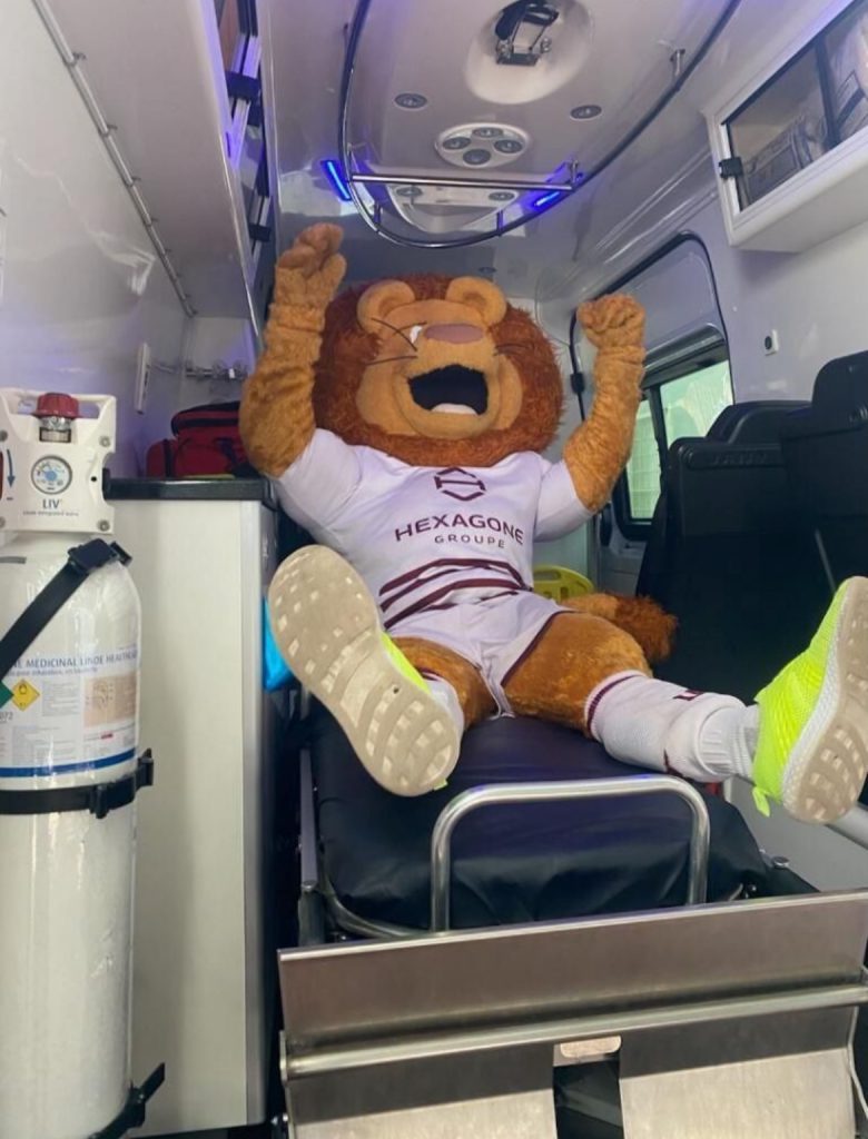 Léo, la Mascotte officielle de l’UBB, s’est installé à l’arrière de l’ambulance, le temps d’une photo, pendant le quart de finale de la coupe d’Europe (UBB 41 – 42 Harlequins).